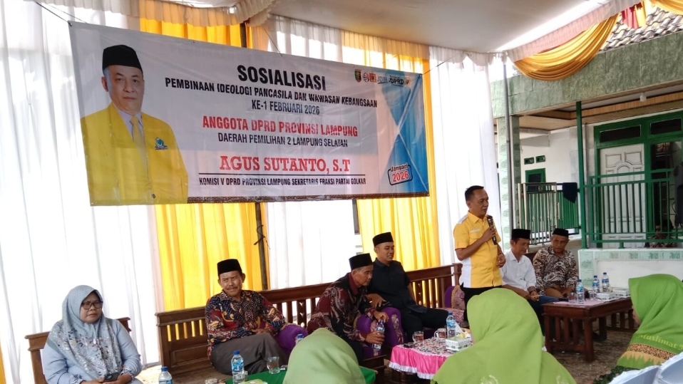 Bandar Lampung : Anggota DPRD Provinsi Lampung dari Fraksi Partai Golkar, Agus Sutanto, menggelar kegiatan Sosialisasi Pembinaan Ideologi Pancasila (PIP) dan Wawasan Kebangsaan pertama pada Februari 2026. Kegiatan tersebut berlangsung pada Minggu (08/02/2026) di Desa Way Gelam, Kecamatan Candipuro, Kabupaten Lampung Selatan.